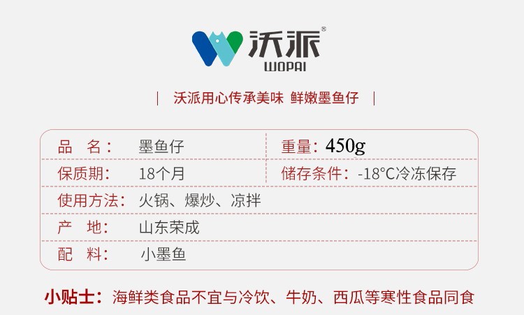 沃派 冷冻墨鱼仔 目鱼仔小墨鱼 450g 袋装 去皮去脏 生鲜火锅食材